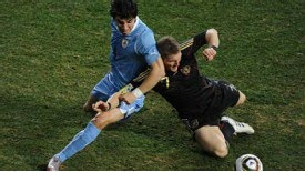Suarez, the striker who has been so deadly for Ajax, spurned an excellent chance to seize the lead when he fired wide late in the first half. The same player was denied again in the second by a reaction block from Hans-Jorg Butt, seconds after he had thwarted Cavani, but Germany's keeper could do nothing when Forlan's first-time shot from the edge of the box.